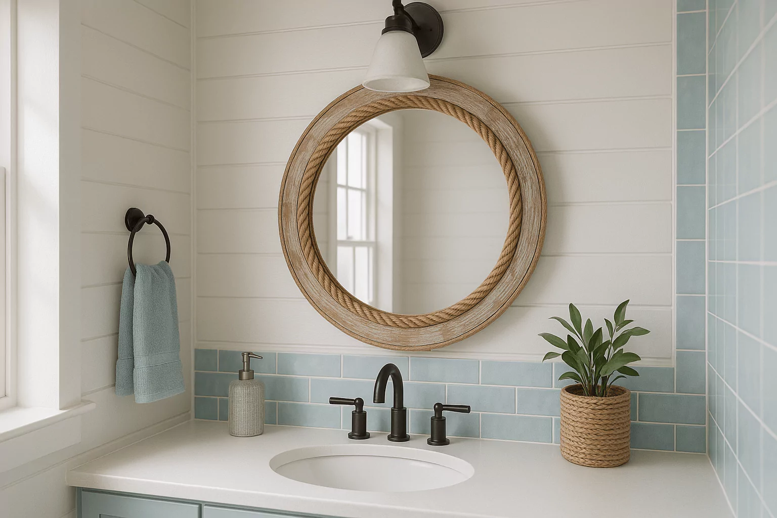 These mirrors fit beautifully into beach homes, spa bathrooms, or nautical-themed powder rooms. Pair it with pale blue or sea-glass tiles, white shiplap, and matte fixtures for full effect.