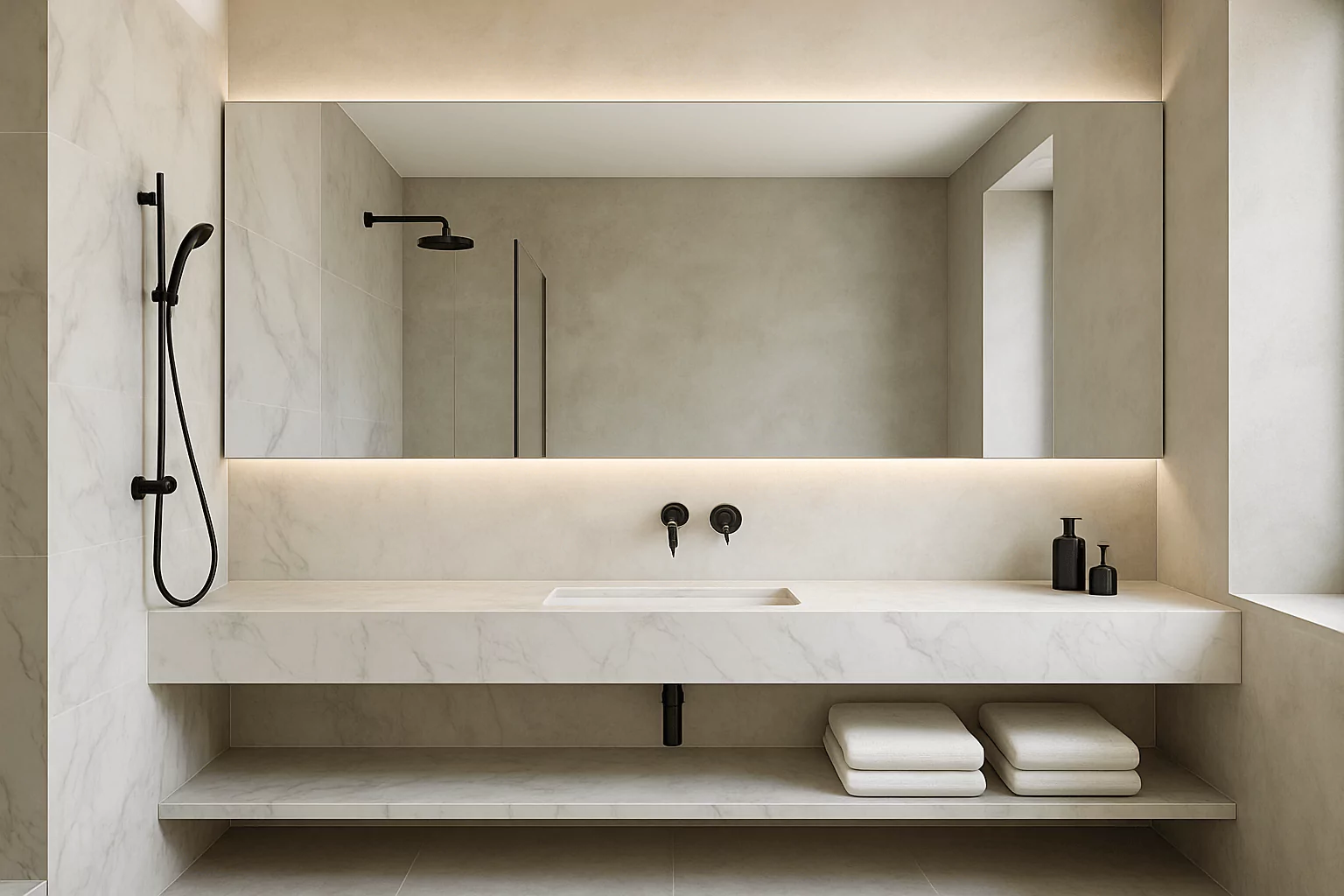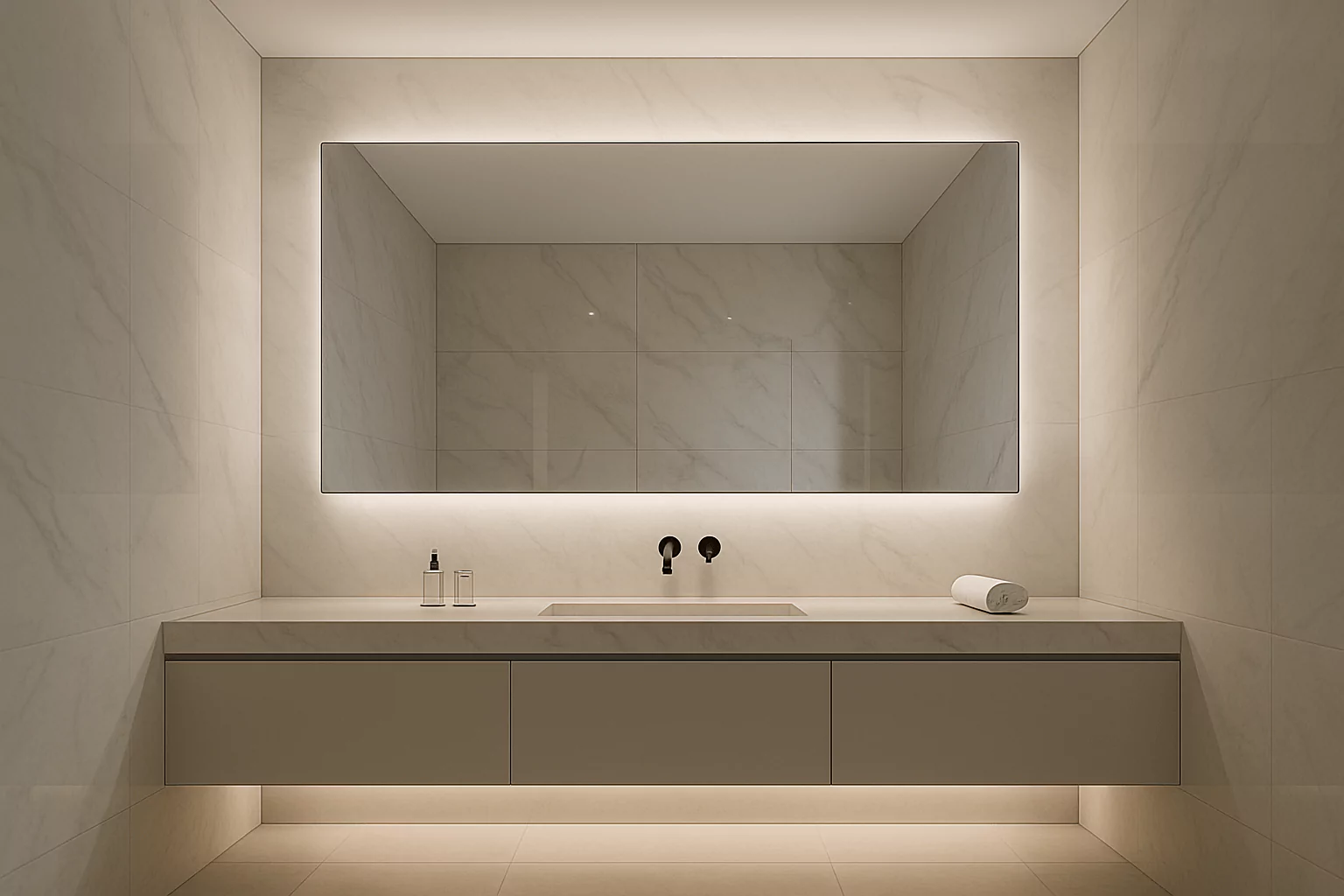 Oversized frameless mirrors expand sightlines, brighten the room, and make compact bathrooms feel significantly larger.