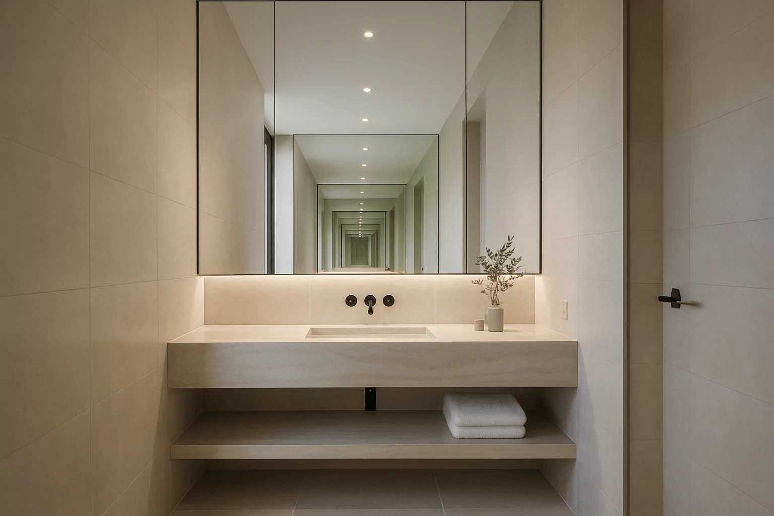 Use a large frameless mirror to anchor the vanity wall. Its scale instantly adds luxury and draws the eye upward.