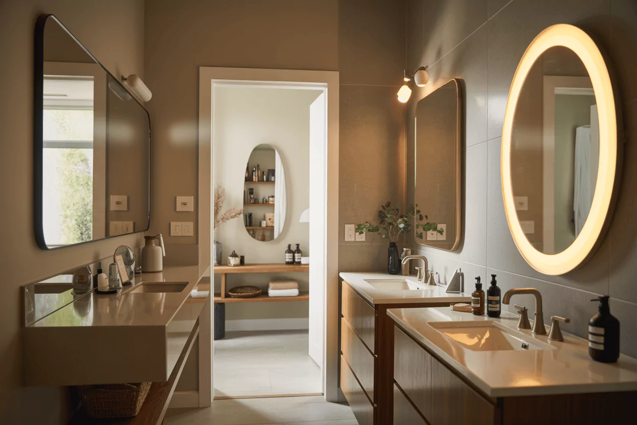 Try a trio of round bathroom mirrors, use oversized bathroom wall mirrors for double vanities, or go bold with unique bathroom mirrors featuring abstract shapes or integrated lighting.