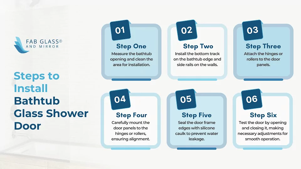 For sliding doors, install the bottom track on the bathtub edge and the side rails along the walls. Ensure the tracks are level and securely fastened.