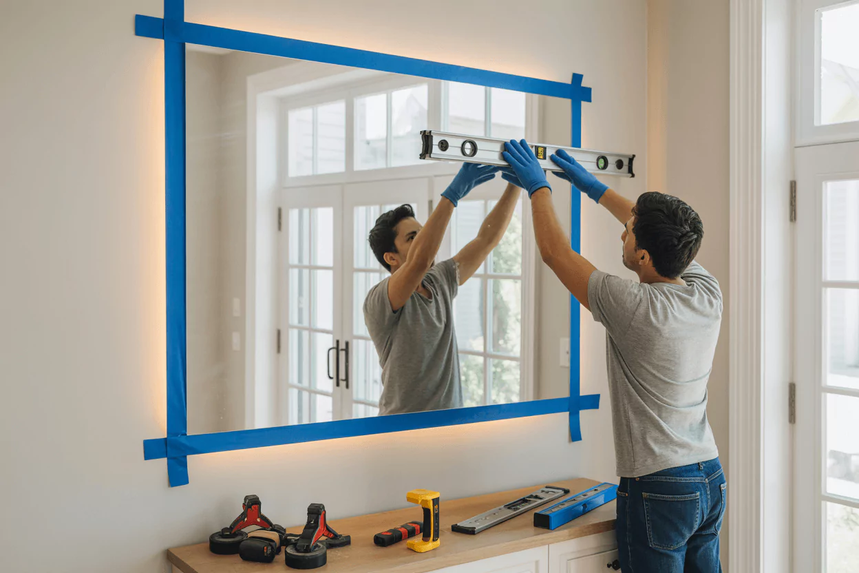 You will need a level, stud finder, drill, wall anchors, mirror clips or adhesive, measuring tape, and safety gear. For LED mirrors, include electrical tools like a voltage tester and wire nuts.