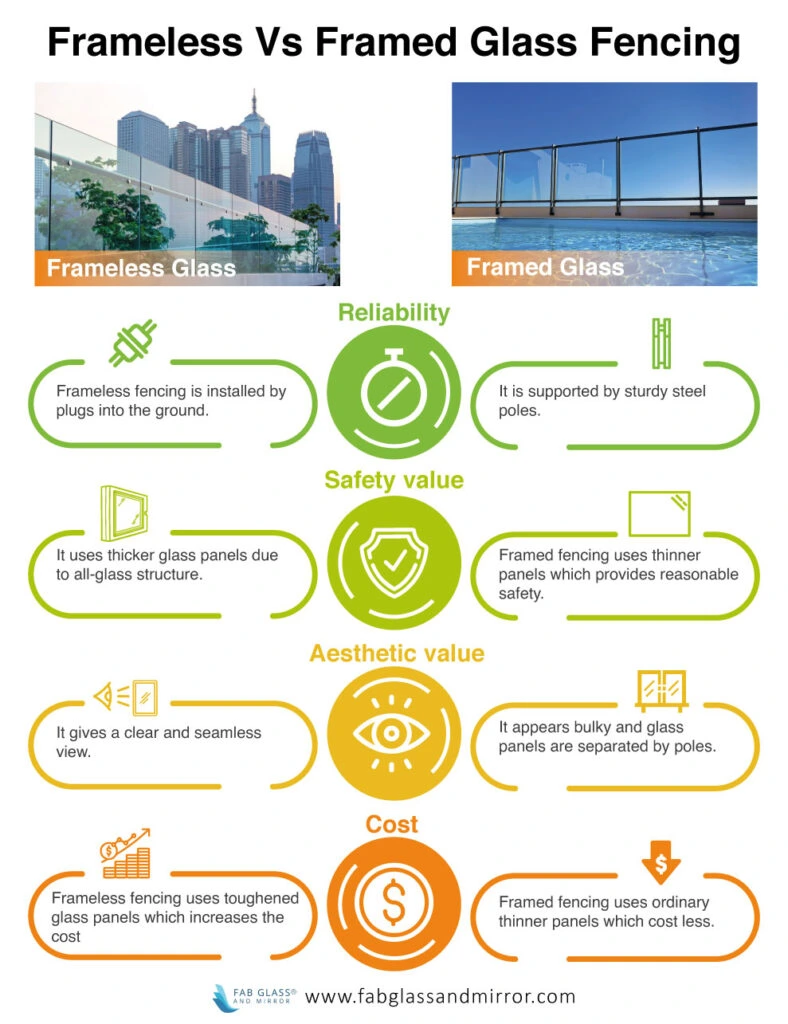 - Framed fences feature a thinner glass panel. Moreover, stainless steel poles are used for