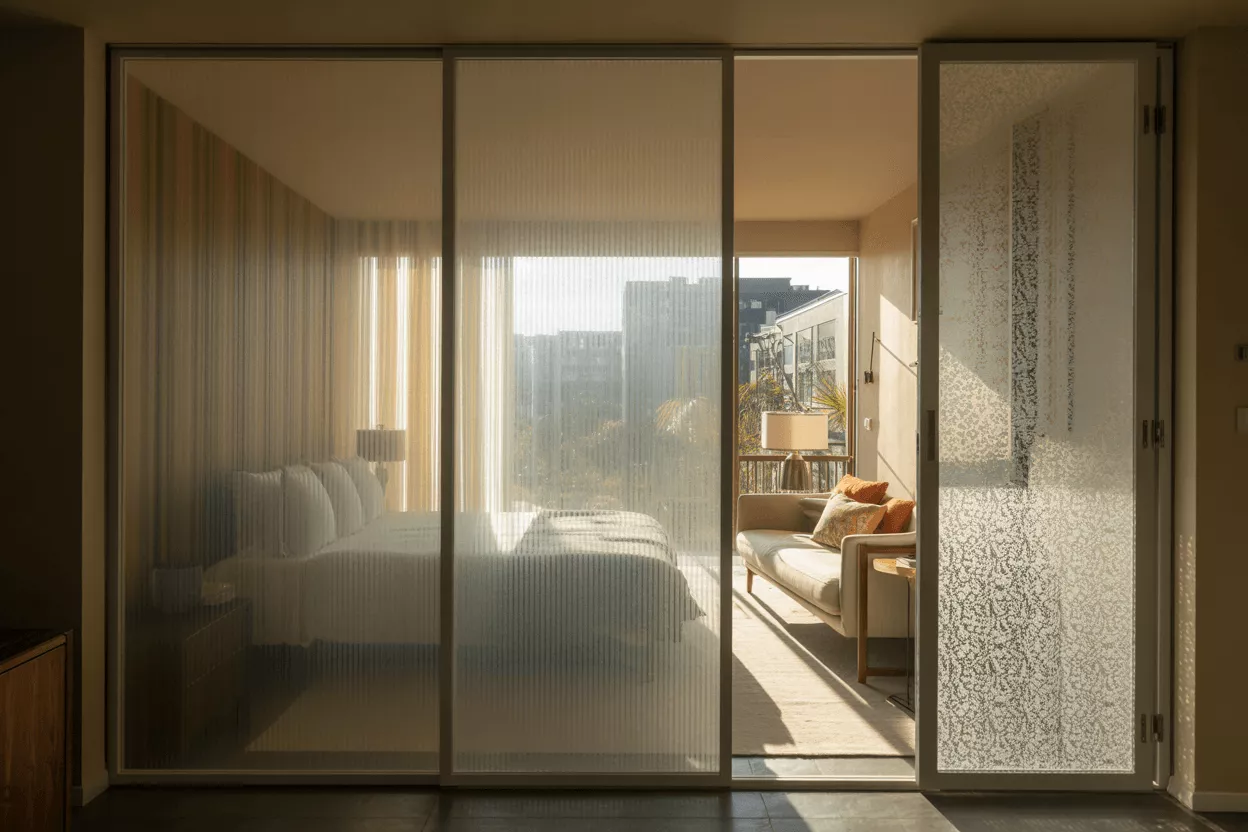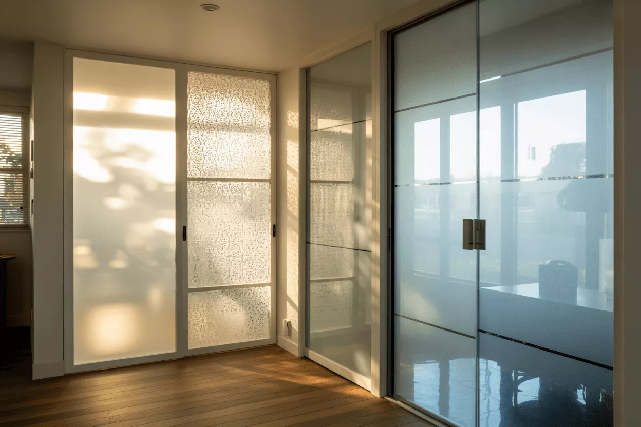 Privacy glass is any pattern glass designed to obscure vision while allowing light through. It ranges from frosted glass to switchable smart panels.