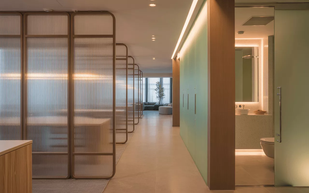 Spraylite tempered glass is a specially treated glass that offers a semi-opaque or diffused surface to enhance privacy while still allowing light to pass through. The name comes from its frosted appearance, which looks as if the surface has been gently sprayed or misted. It is particularly valued in commercial and healthcare settings where visual separation is needed without compromising illumination.
